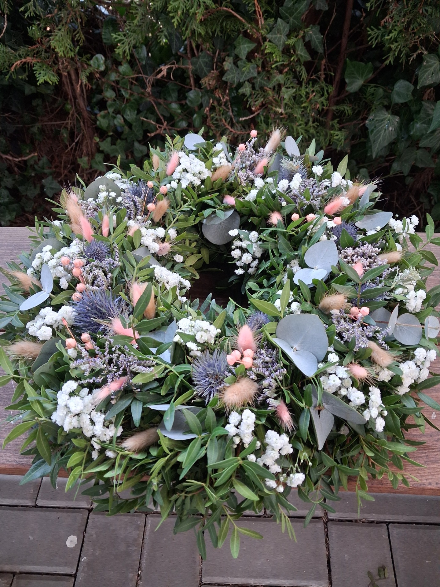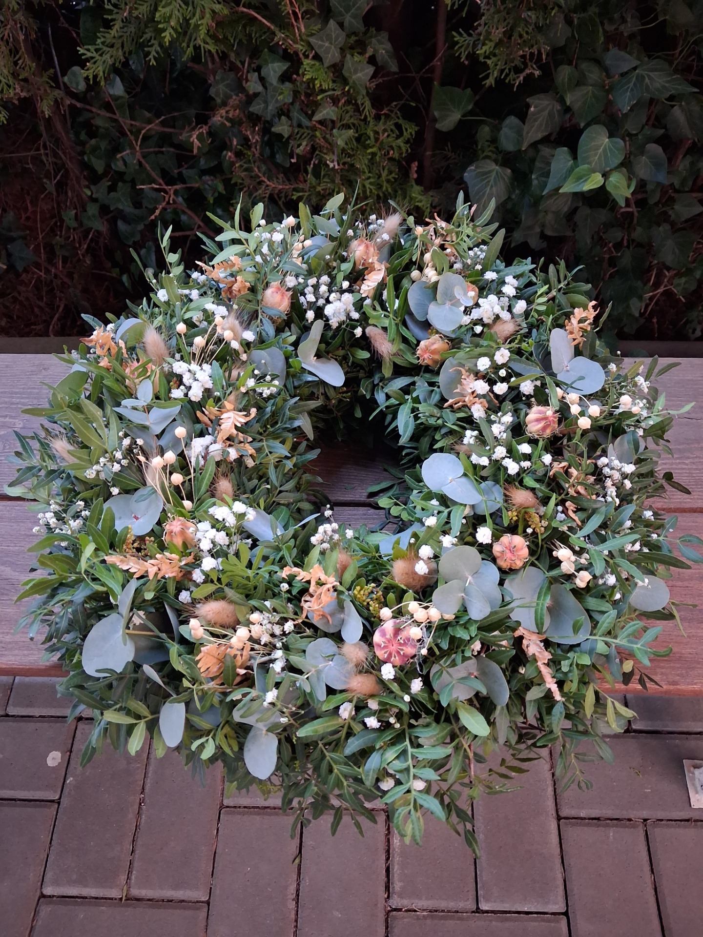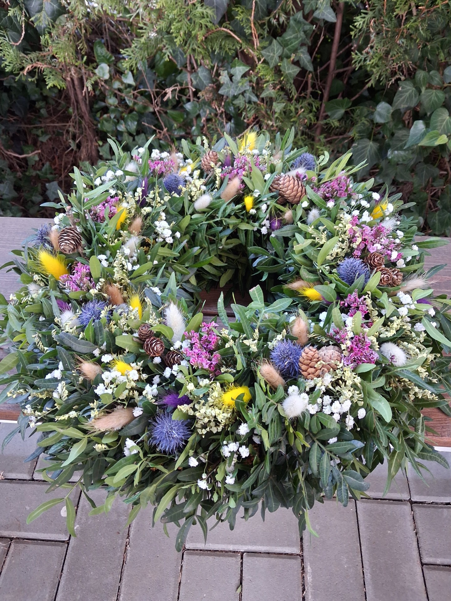 Materiál na těchto věncích přirozeně sesychá, čímž se mění charakter i vzhled věnce a tak je s ním třeba zacházet. Jedná se o přírodní materiál, tedy přirozeně dojde časem k vyblednutí použitého materiálu. Věnce jsou sezónní, tedy jejich trvanlivost tomu odpovídá. Vliv na jejich trvanlivost má zejména jejich umístění. Standardní velikost hotových věnců je cca 43 -45 cm, ale je možné udělat menší i větší průměr, a sice cca 35-38 cm nebo cca 50-55 cm, v případě zájmu mě kontaktujte na email.
