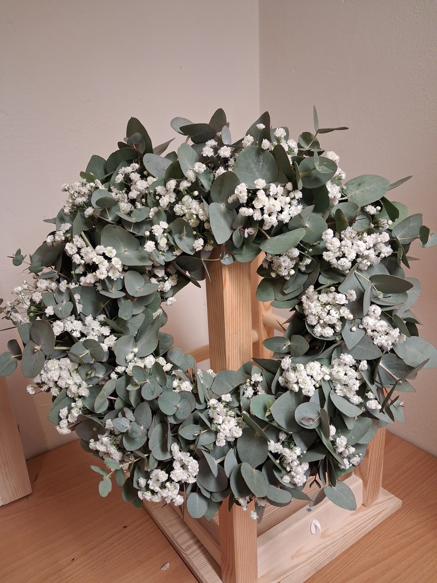 Základ věnce je z pistácie, která po uschnutí zůstane stále zelená, věnec se tedy v podstatě téměř nezmění a bude Vám dělat radost dlouhé týdny a to hlavně v interiéru. Pokud chcete, aby Vám věnec vydržel co nejdéle, nevystavuje ho dešti a přímému slunečnímu svitu, v opačném případě rychle vybledne.