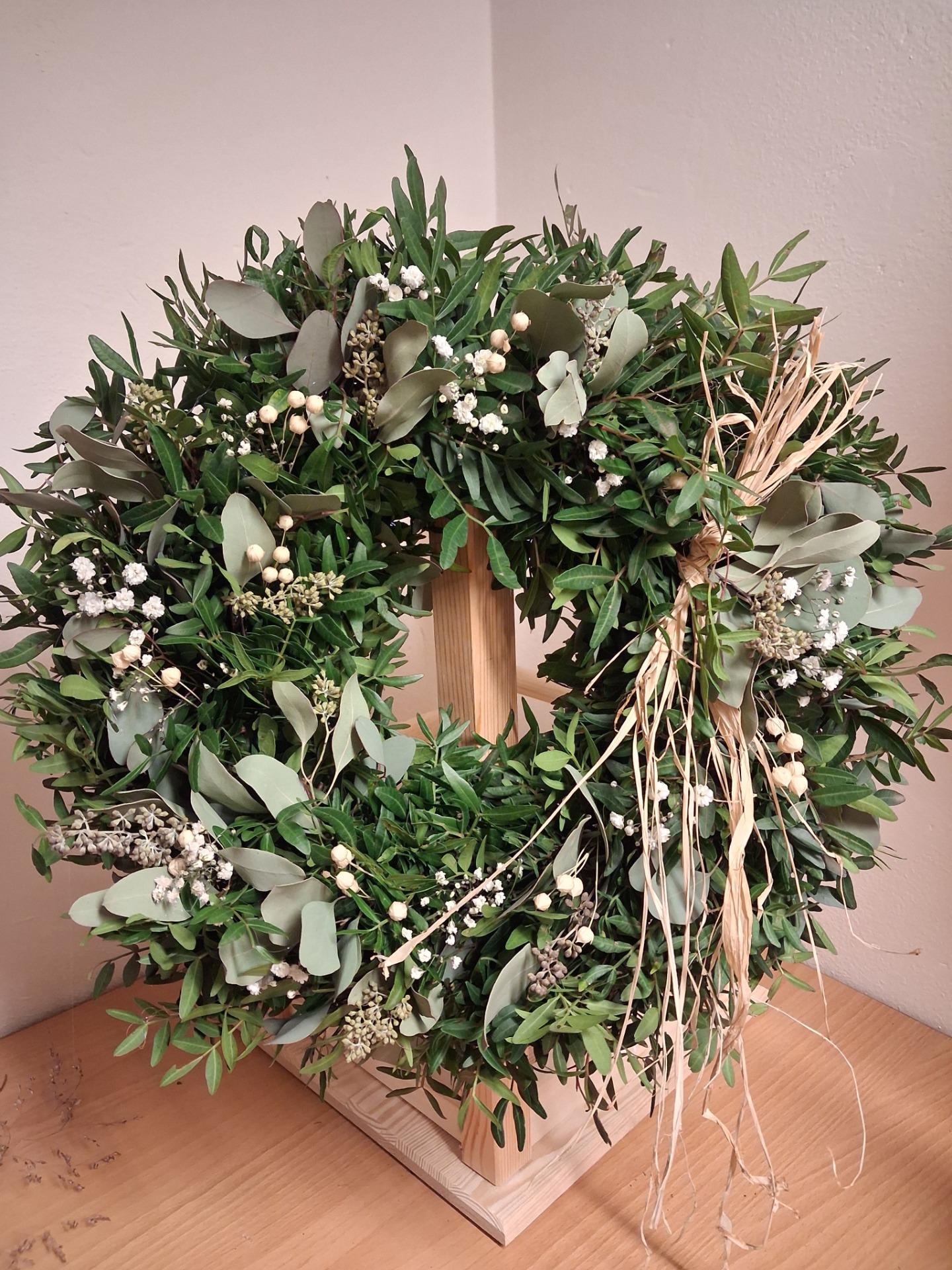 Přírodní věnec z pistácie, gypsophily a eukalyptu, velikost cca 40 cm. Věnec přirozeně seschne a bude Vám dělat radost dlouhé týdny. Nevystavovat dešti a přímému slunečnímu svitu.