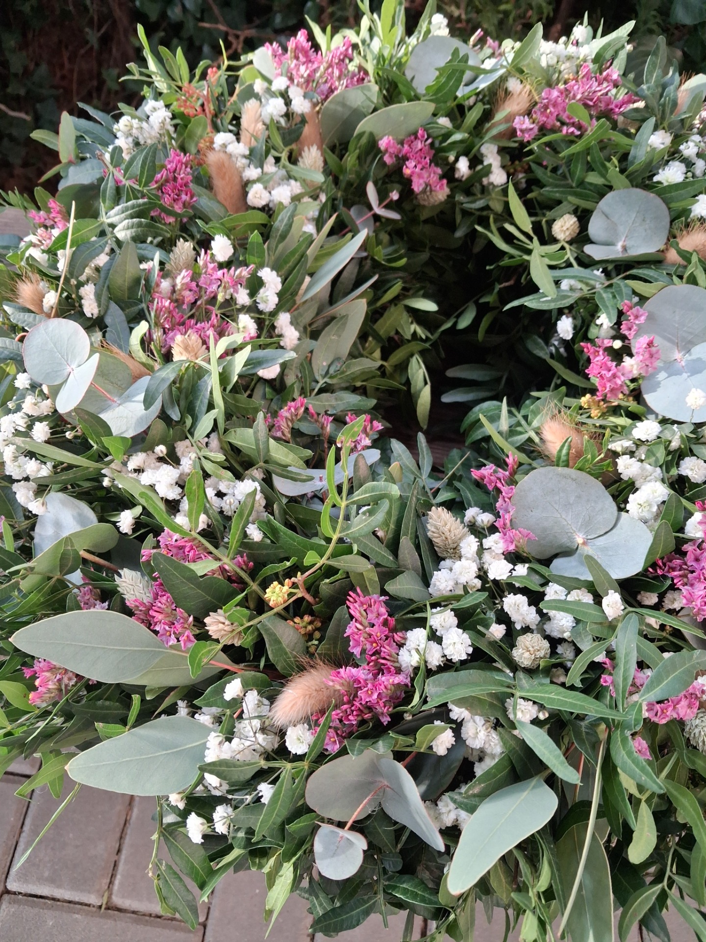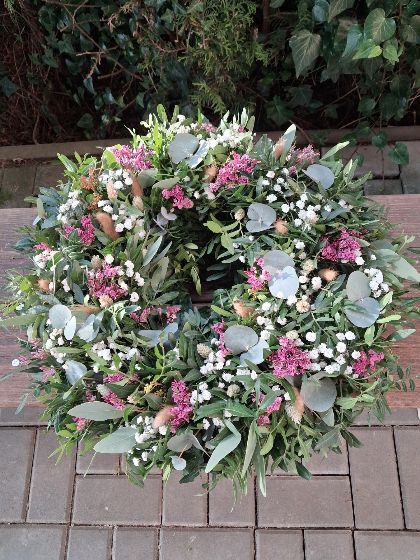 Přírodní věnec z pistácie, eukalyptu a sušiny, velikost cca 43-45 cm. Věnec je vázaný na slaměném kruhu, začištěný floristickou páskou. Základ je z čerstvého materiálu, věnec postupně seschne a stane se z něj sušinová dekorace. Pro delší životnost nevystavujte přímému slunečnímu svitu a vlhkosti. Věnec může být zavěšen i na venkovnich dveřích, zkrátí se tim ale jeho životnost, pokud bude vystaven povětrnostním vlivům.