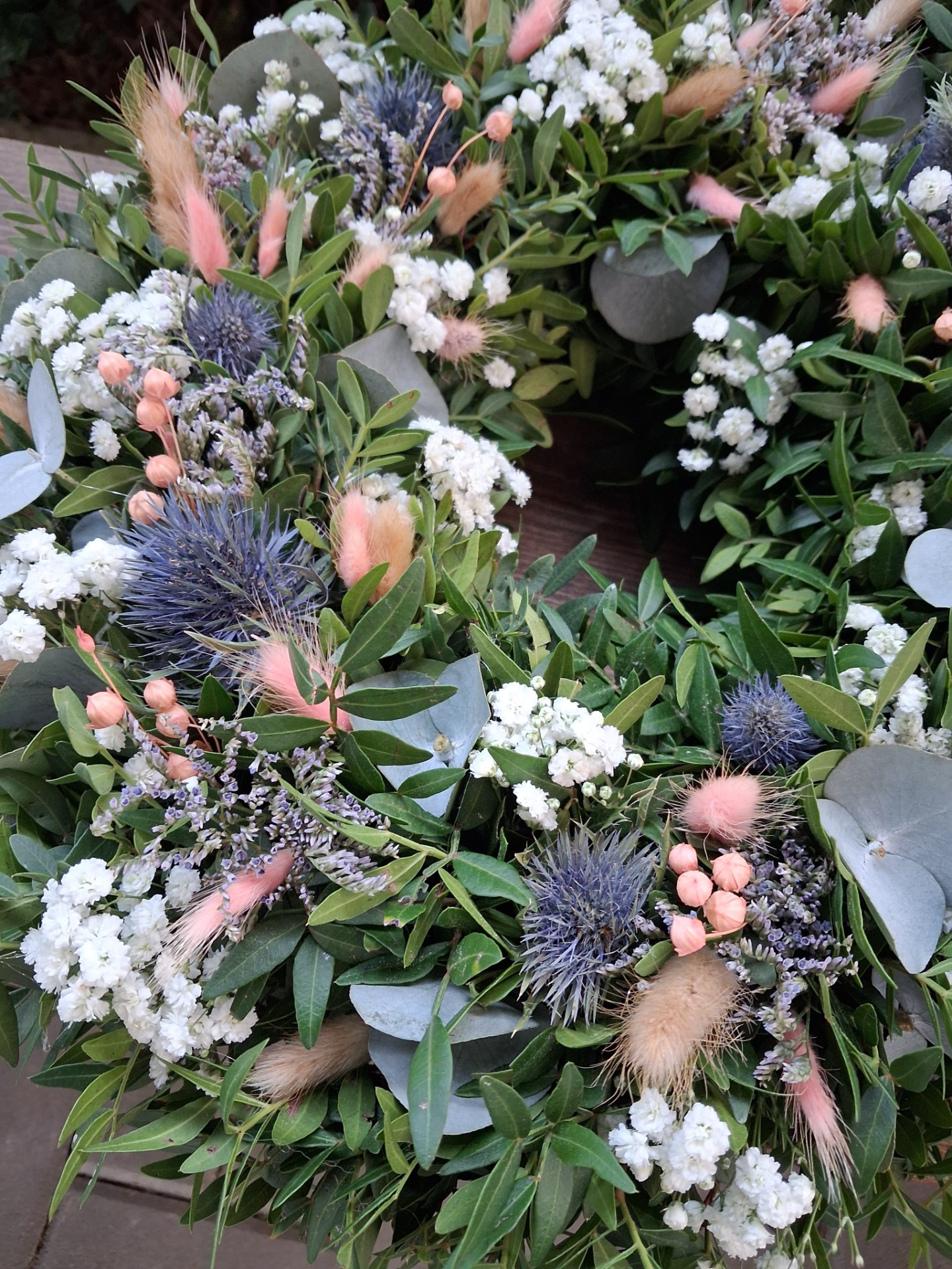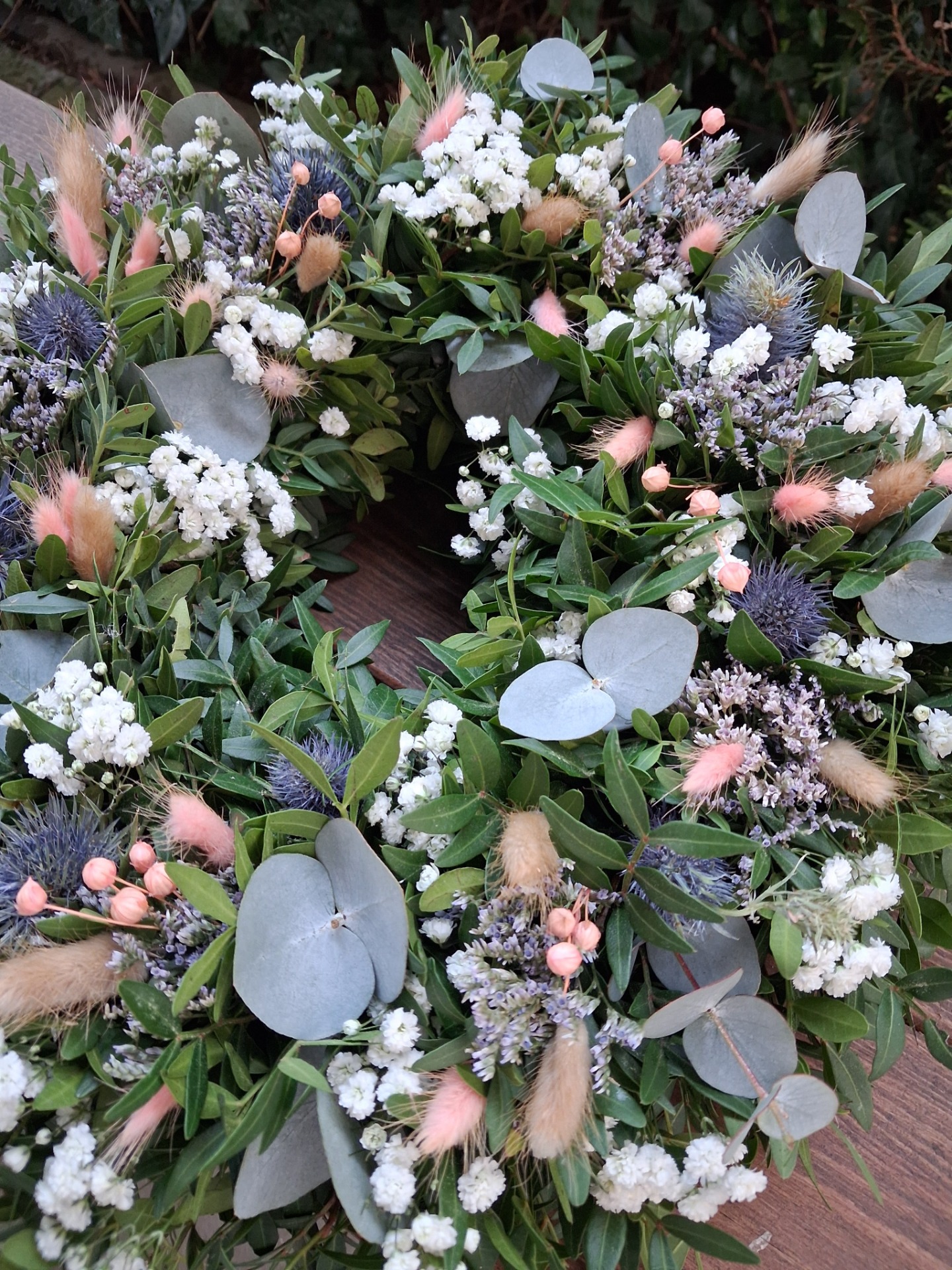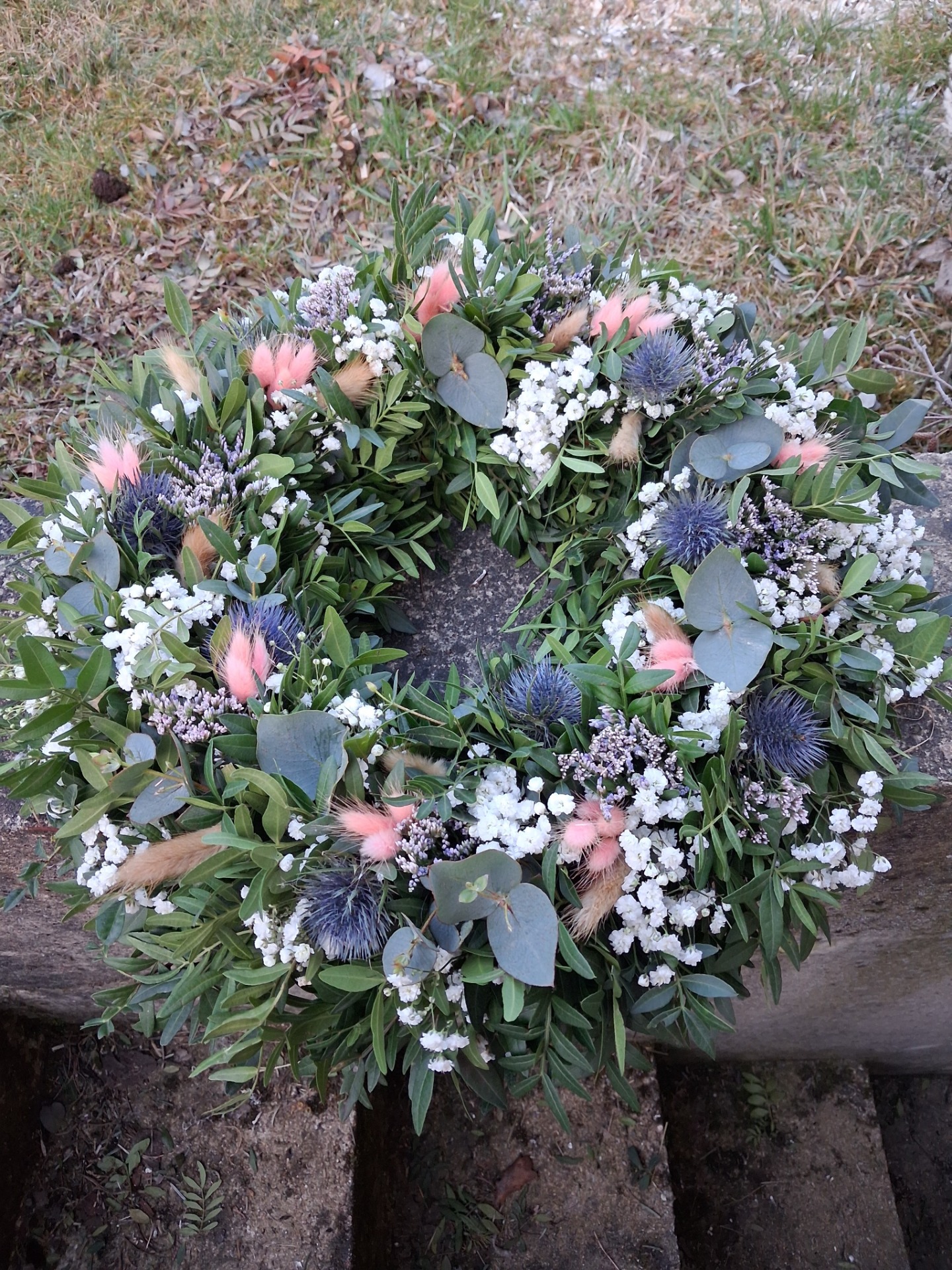 Přírodní věnec z pistácie, eukalyptu a sušiny, velikost cca 43-45 cm. Věnec je vázaný na slaměném kruhu, začištěný floristickou páskou. Základ je z čerstvého materiálu, věnec postupně seschne a stane se z něj sušinová dekorace. Pro delší životnost nevystavujte přímému slunečnímu svitu a vlhkosti. Věnec může být zavěšen i na venkovnich dveřích, zkrátí se tim ale jeho životnost, pokud bude vystaven povětrnostním vlivům.