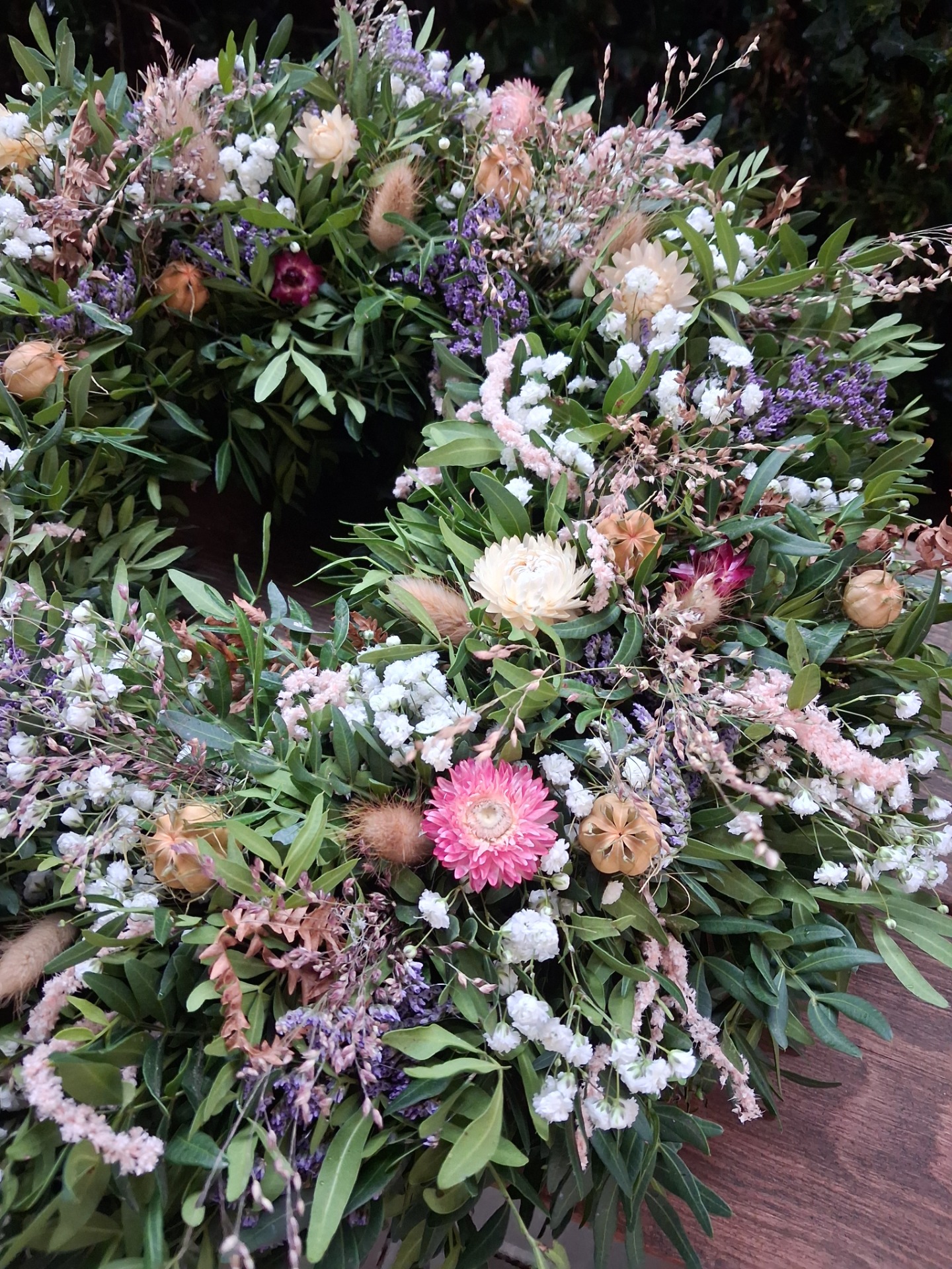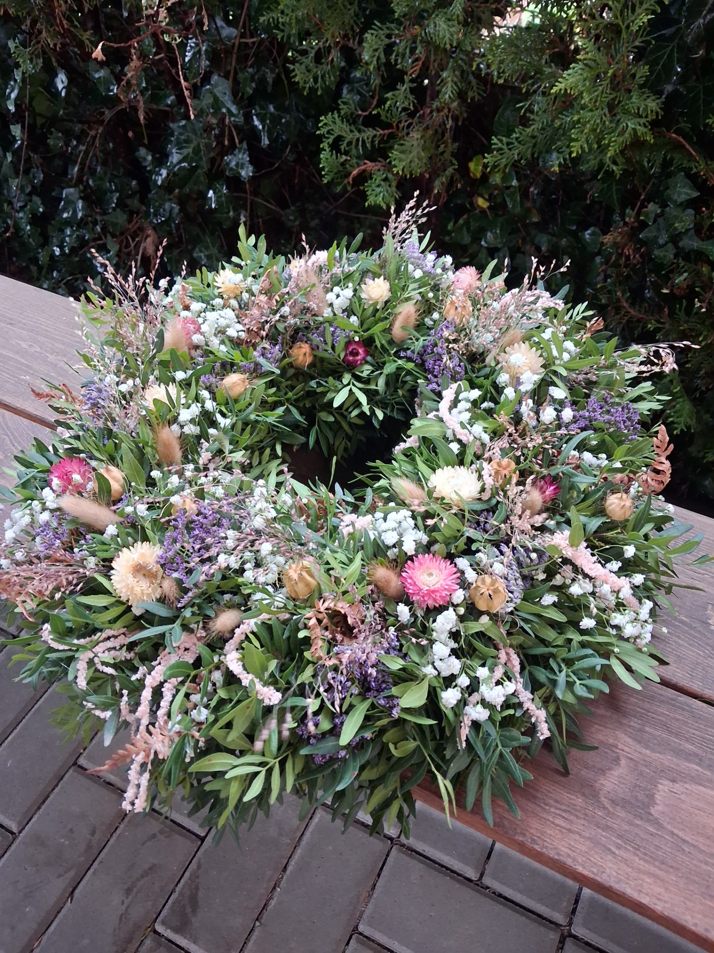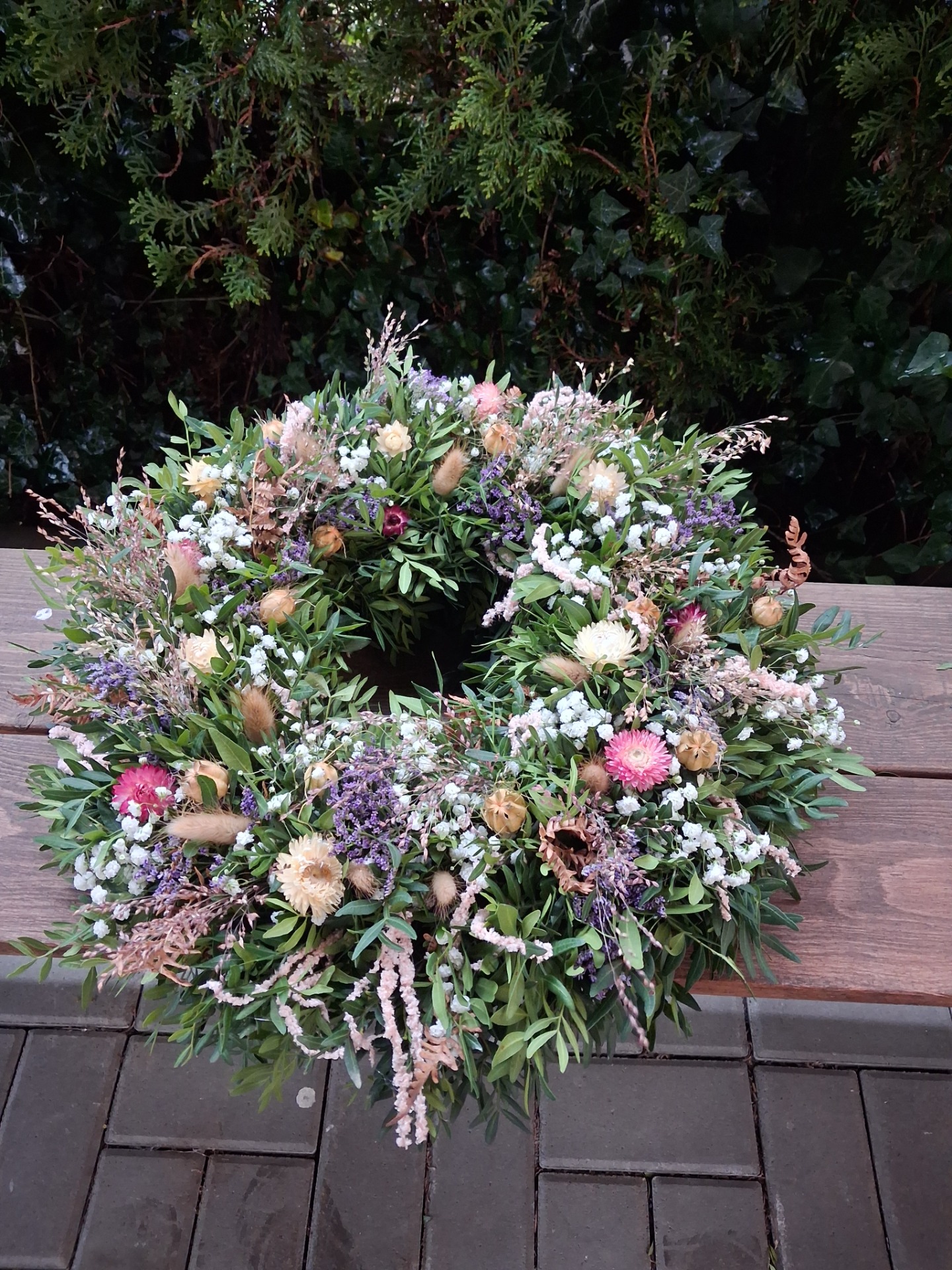 Přírodní věnec z pistácie, eukalyptu a sušiny, velikost cca 43-45 cm. Věnec je vázaný na slaměném kruhu, začištěný floristickou páskou. Základ je z čerstvého materiálu, věnec postupně seschne a stane se z něj sušinová dekorace. Pro delší životnost nevystavujte přímému slunečnímu svitu a vlhkosti. Věnec může být zavěšen i na venkovnich dveřích, zkrátí se tim ale jeho životnost, pokud bude vystaven povětrnostním vlivům.